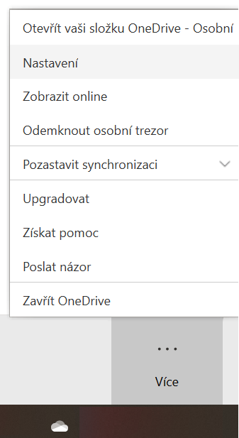 Jakmile se do aplikace OneDrive přihlásíte, zobrazí se na hlavním panelu v oznamovací oblasti její ikona, tedy ikona mraku. Přes ní také můžete přidat ještě další účty, například váš pracovní nebo školní účet. Na hlavním panelu klikněte na ikonu OneDrive. Pokud máte potíže a nemůžete mráček najít, znamená to pravděpodobně, že OneDrive zrovna neběží. Zkuste ho znovu vyhledat přes nabídku Start. Po tomto mezikroku by se měla ikona opět objevit vpravo dole. Poté zvolte možnost Více a dále Nastavení.