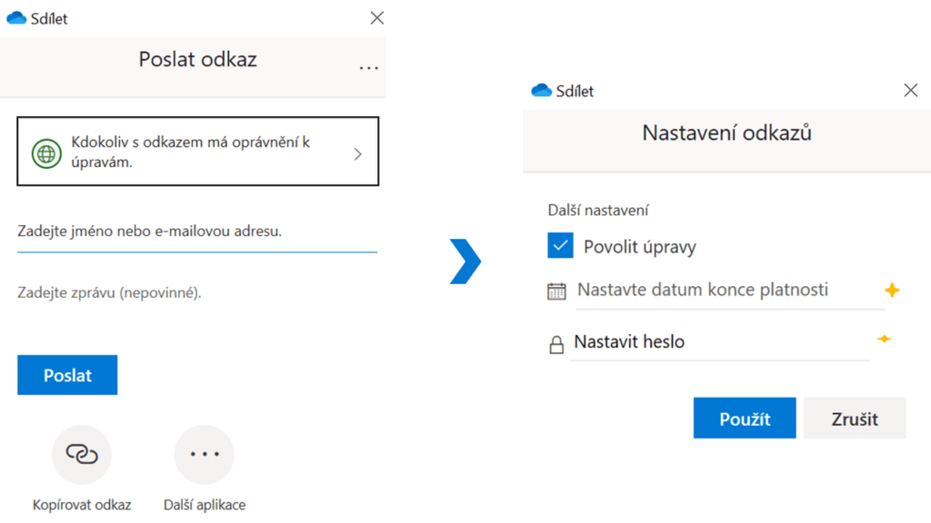 Lze zde rovnou napsat e-mailové adresy i samotný text zprávy nebo sdílet v dalších aplikacích. Můžete také podrobně nastavit samotný odkaz, oprávnění držitelů odkazu. Jsou zde možnosti jako povolení k úpravám, kde lze nastavit dobu, po níž bude toto povolení pro dotyčné platit, dokonce i heslo. Tím si můžete být jisti, že vaše soubory neuvidí nikdo jiný, než komu je sdílíte.