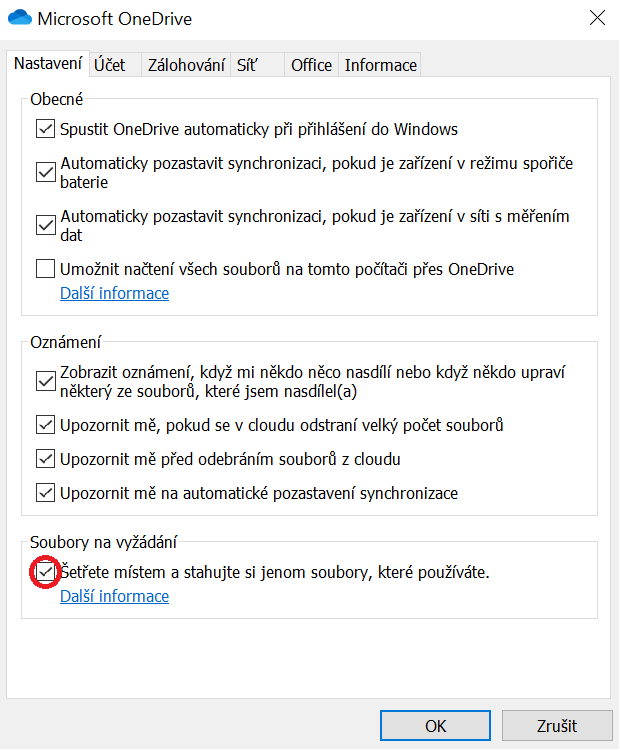 Tentokrát se ale zaměříme na záložku Nastavení. V ní zaškrtněte položku úplně dole, a tedy Šetřete místem a stahujte si jenom soubory, které používáte. Tlačítkem OK akci potvrďte. Jak si můžete všimnout, pod záložkou nastavení se toho nachází celkem hodně, ať už ohledně synchronizace a úspory dat či baterie, tak i oznámení, díky kterým můžete být informováni téměř o všem.
