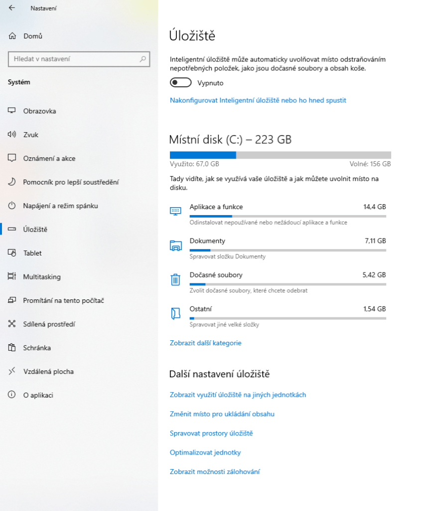 Jako první důležitý krok můžeme označit kontrolu, kolik volného místa máme na disku. To lze zjistit hned několika způsoby. Jako prvním z nich můžeme označit jednoduché otevření Průzkumníka souborů. Zde si na levé straně karty vyberte Tento počítač a když sjedete až dolů, tak v Zařízení a jednotky uvidíte Místní disk a zde zjistíte, kolik máte volných GB z celkové kapacity. Druhý způsob vede přes Nastavení. Po rozkliknutí již známého ozubeného kolečka si zvolíte Systém a zde v levé části najdete Úložiště. Tady kromě volných GB vidíte i jak a co vaše úložiště využívá nejvíce, což vám může pomoci při uvolňování místa na disku.