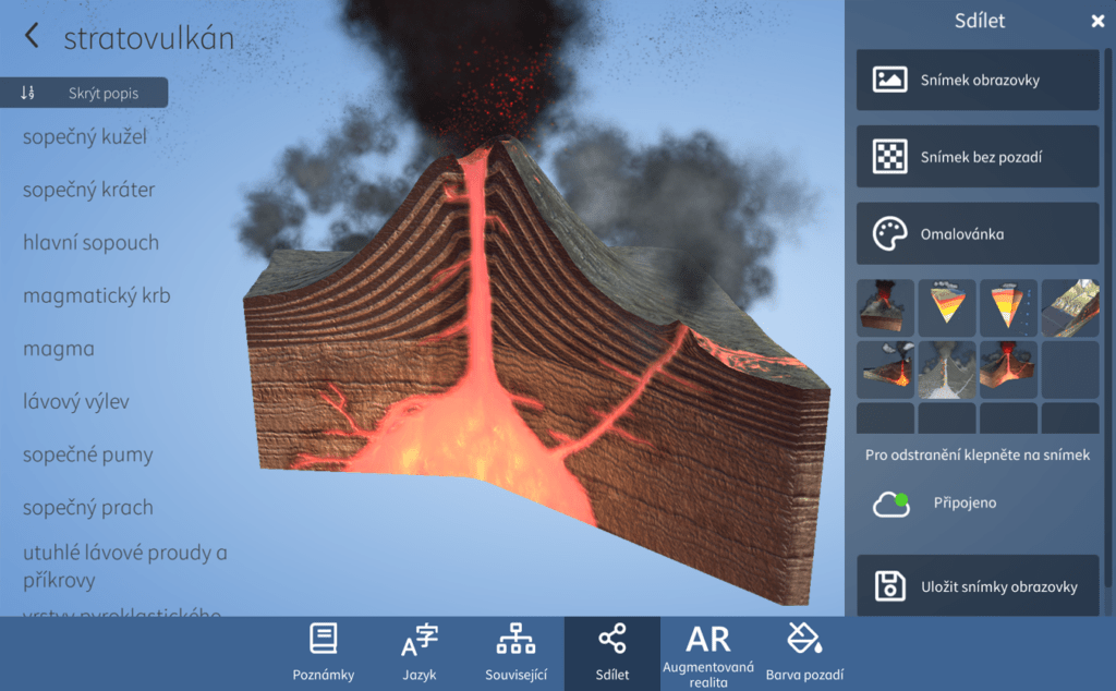 U každého z modelů jsou plně k dispozici i další, doplňující funkce, což jsou poznámky, sdílení, změna jazyka, barvy pozadí a také funkce související, které najdeme na liště nacházející se na spodní straně obrazovky. Při rozkliknutí poznámek nám vyjedou na pravé straně obrazovky základní informace, kde je stručný popisek, který vysvětlí, co všechno můžeme na zvoleném 3D modelu vidět a k čemu to případně slouží, což řadím mezi další vysokou edukační hodnotu. Velikou výhodou je i možnost přidat své vlastní poznámky kliknutím na Poznámky a poté Vlastní poznámky. Zde můžeme svůj text přímo napsat nebo vložit z dokumentu.