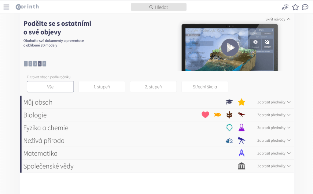 Po spuštění aplikace nám vyjede hlavní stránka s přehledným rozřazením do předmětů, kde lze zároveň vidět i náhledy 3D modelů se stručným popiskem. Jednotlivé karty předmětů lze skrýt, takže při hledání modelu z matematiky nemusíme sjet až úplně dolů, ale stačí najít předmět Matematika, ten si zobrazit a jednoduše si vybrat jeden z jeho modelů. Samozřejmě zde najdeme i možnost Hledat, kde místo zdlouhavého projíždění stačí napsat název hledaného modelu a ten se nám zobrazí.