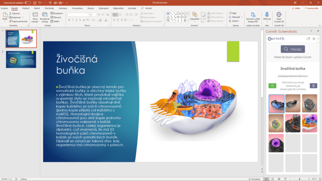 Funkce přímého sdílení je momentálně k dispozici u aplikací Word a PowerPoint. Nejprve je potřeba stáhnout si integraci do daných programů. Pak stačí jen propojit Corinth s aplikacemi Office pomocí kódu generovaného v hlavním menu uživatele. V momentě, kdy jsou aplikace synchronizované, uvidíme snímky modelů pořízené v Corinthu přímo v PowerPointu nebo ve Wordu. Po kliknutí na Sdílet se opět otevře panel na pravé straně obrazovky. Zde si zvolíme, co vlastně chceme sdílet (pouze model, model i s pozadím nebo slepá mapa modelu, tzv. omalovánka) a to se nám bude postupně řadit v náhledech vedle sebe. Pokud bude potřeba nějaký z vytvořených obrázků odstranit, stačí na něj pouze kliknout. Všechny obrázky se nasdílí rovnou do bočního panelu prezentace či textového dokumentu, odkud je můžeme následně libovolně vkládat. Navíc v Corinthu existuje i možnost si zvolit uložení snímků vybraných modelů do počítače ve formě obrázků, konkrétně je naleznete ve složce Obrázky.